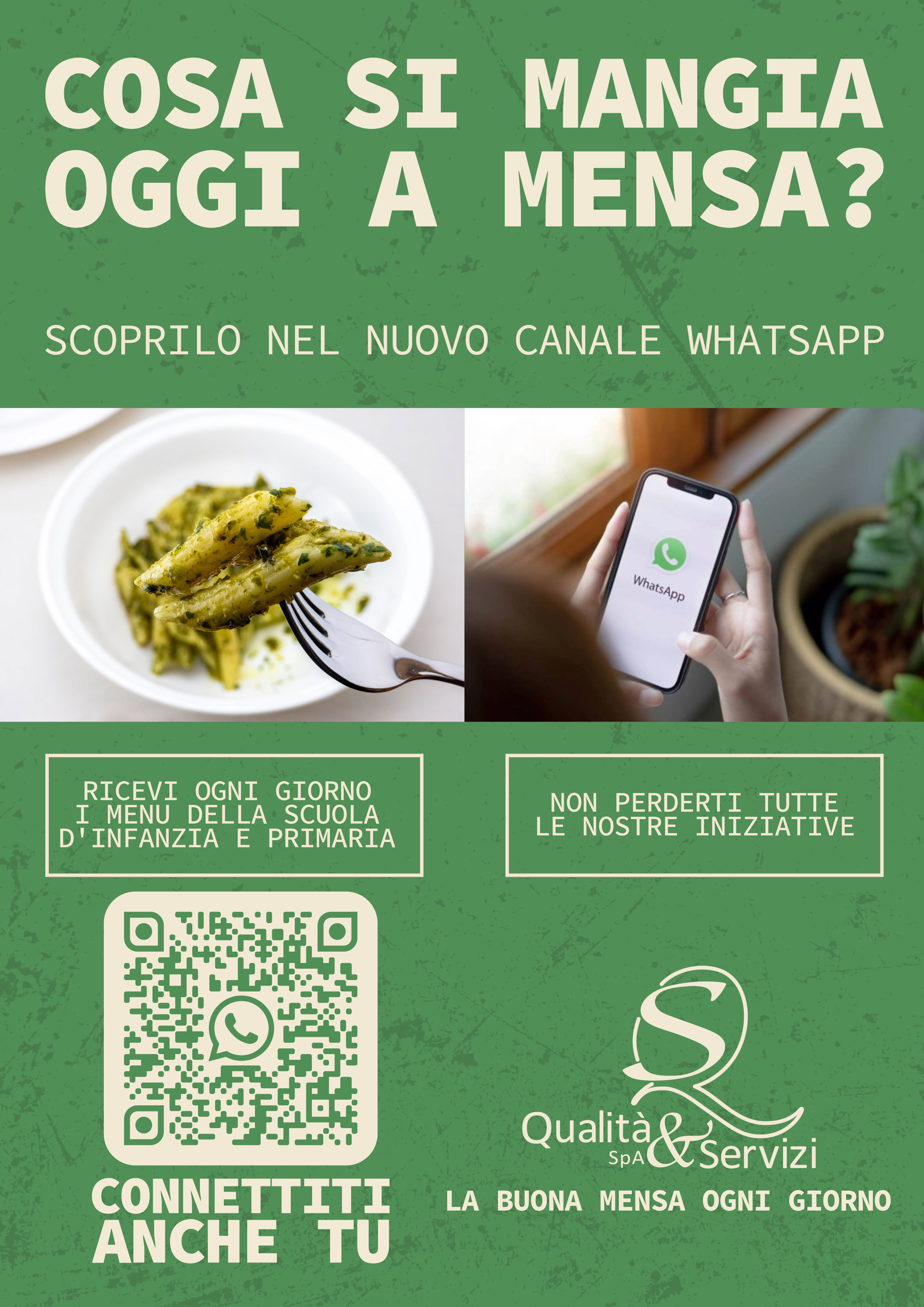 Al fine di essere più vicini alle famiglie e di semplificare l’accesso alle informazioni, Qualità e Servizi ha attivato un canale WhatsApp su cui verranno pubblicati tutti gli aggiornamenti relativi ai menù giornalieri per le scuole dell’infanzia e le scuole primarie, oltre alle iniziative organizzate da Qualità e Servizi durante l’anno.