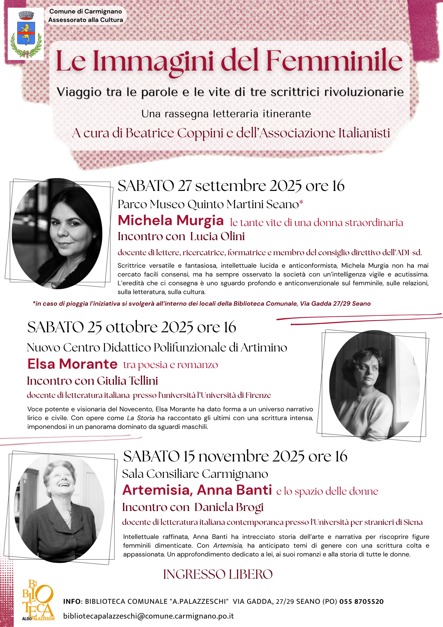 La rassegna itinerante “Le Immagini al Femminile”, a cura di Beatrice Coppini e dell’Associazione Italianisti, promossa dalla Biblioteca Comunale “A.Palazzeschi” di Seaano, propone tre incontri dedicati a Michela Murgia, Elsa Morante e Anna Banti, con letture e riflessioni a cura di studiose e docenti universitarie.