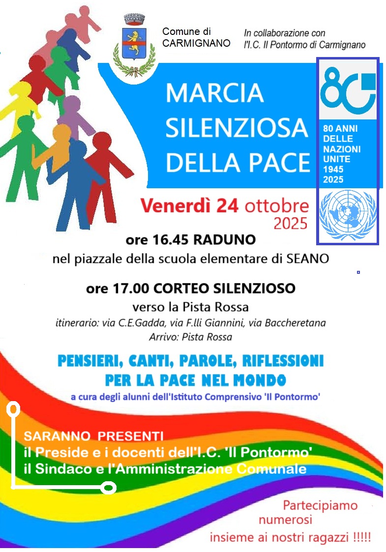 In occasione della Giornata mondiale dell’Onu, che celebra l’80° anniversario dell'entrata in vigore, nel 1945, della Carta delle Nazioni Unite, atto fondativo dell’organismo internazionale, l’Amministrazione Comunale di Carmignano in collaborazione con l’Istituto Comprensivo “Il Pontormo” di Carmignano organizzano per venerdì 24 ottobre una Marcia silenziosa della Pace.