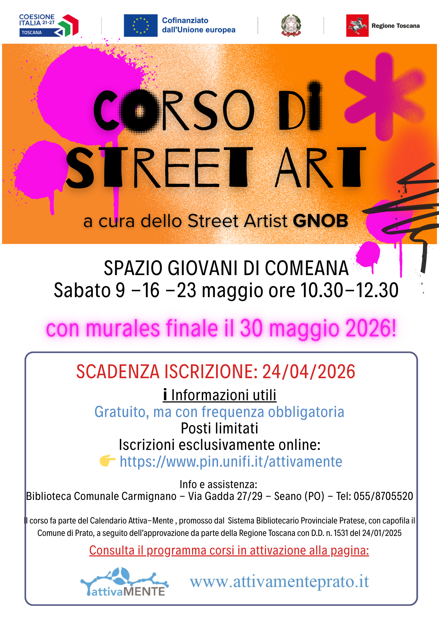 Il percorso fa parte del catalogo AttivaMENTE , promosso dal Sistema Bibliotecario Provinciale Pratese (con capofila il Comune di Prato) e coordinato dal PIN - Polo Universitario Città di Prato . L'iniziativa è realizzata grazie all'approvazione della Regione Toscana (D.D. n. 1531 del 24/01/2025) e al cofinanziamento dell' Unione Europea .