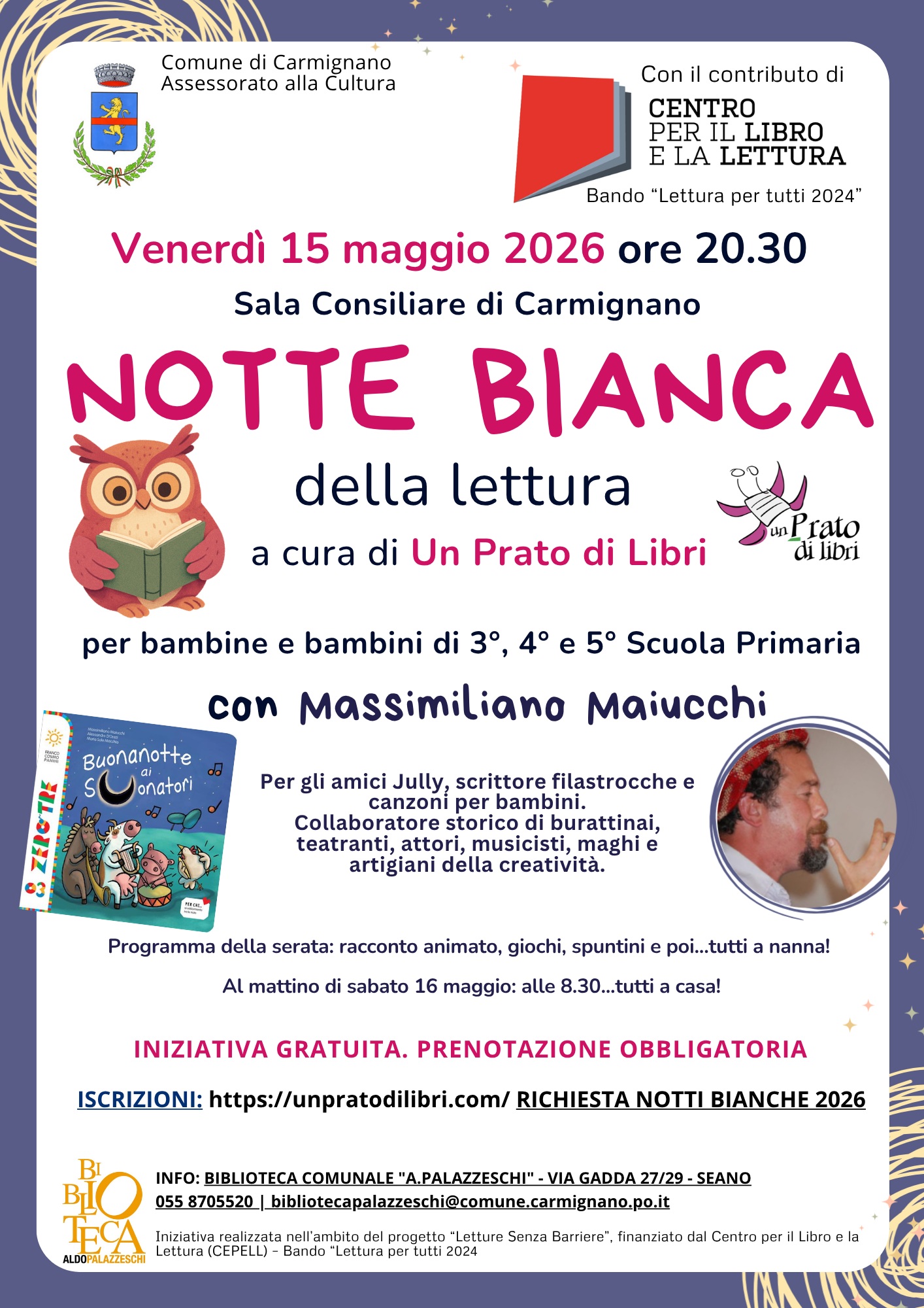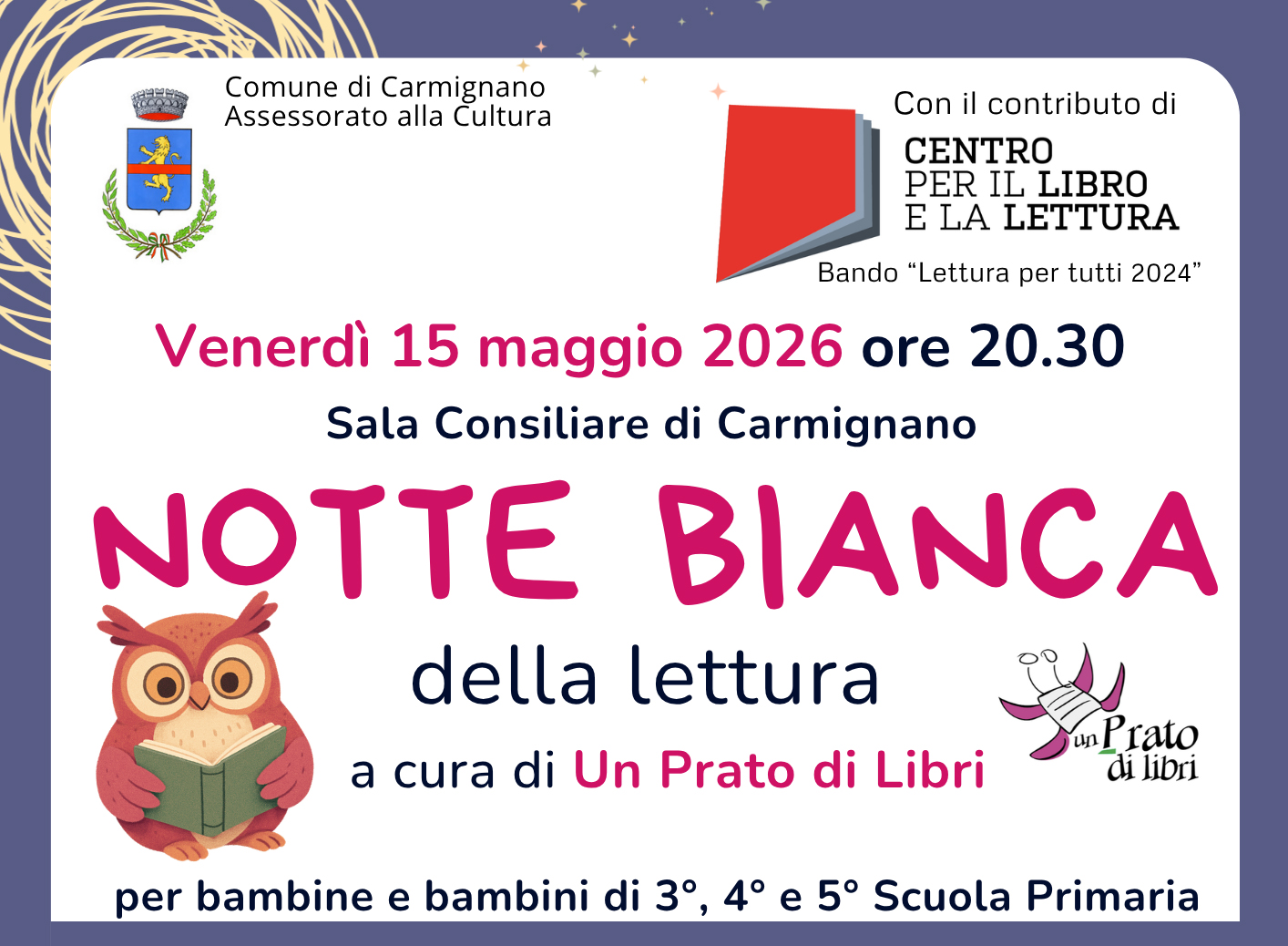 Il Comune di Carmignano presenta un nuovo evento magico dedicato ai giovani lettori: la Notte Bianca della Lettura per bambine e bambini di 3ª, 4ª e 5ª della Scuola Primaria.