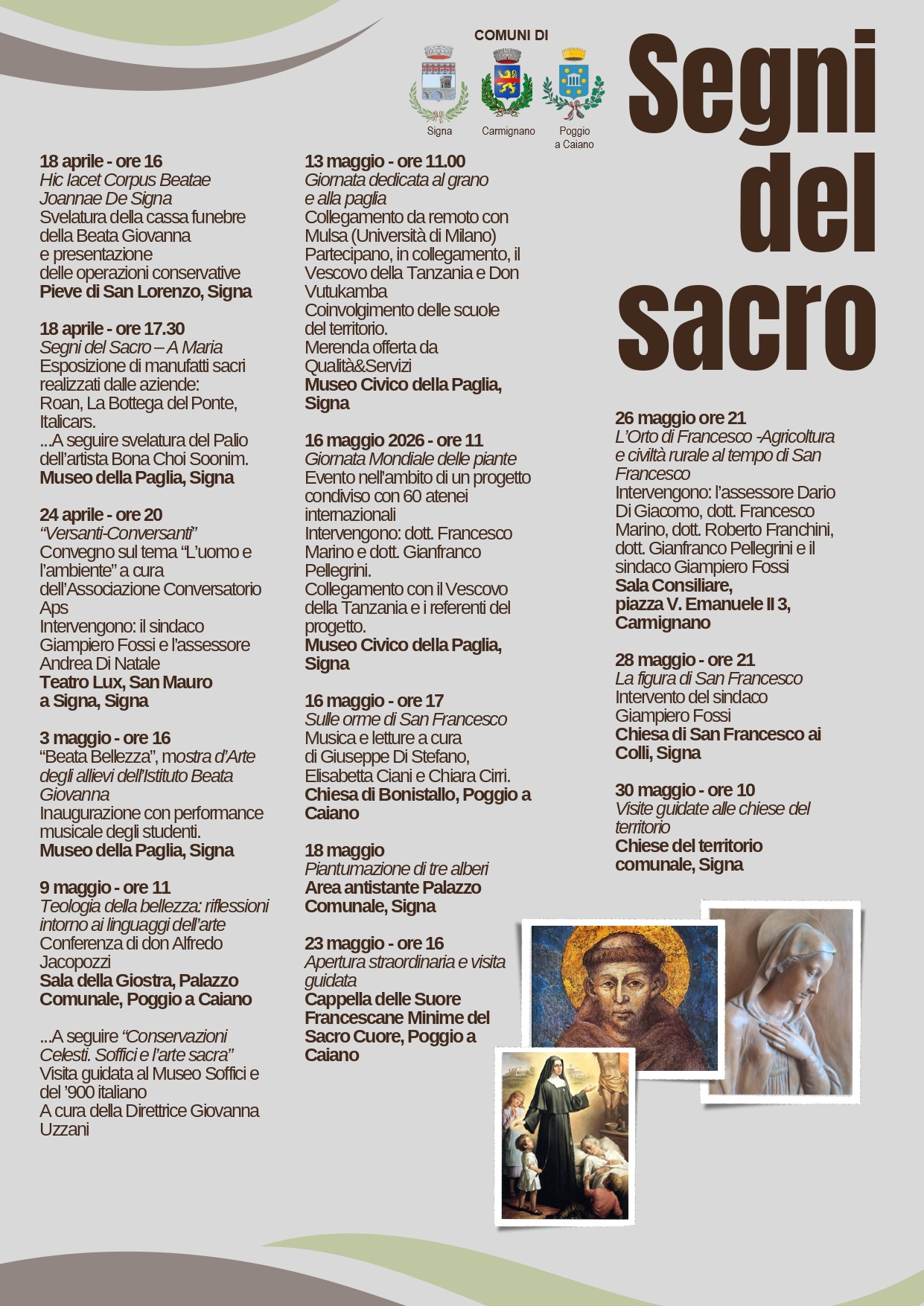 Il programma celebra la ricorrenza principale del 2026: gli 800 anni dalla morte di San Francesco e prende il via da Signa con la svelatura della cassa funebre della Beata Giovanna e la presentazione dell’intervento conservativo, per proseguire con la mostra “A Maria” e altri appuntamenti culturali tutti sotto il segno dell’umanità, della spiritualità e dell’arte.